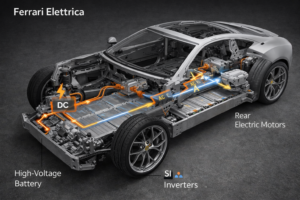 Στο Ferrari Elettrica, η τάση του συστήματος είναι περίπου 800 V (210 κυψέλες σε σειρά) – αυτό επιτρέπει υψηλή ισχύ με χαμηλότερη ένταση ρεύματος, μειώνοντας τις θερμικές απώλειες στα καλώδια και τους ημιαγωγούς. Η μπαταρία επίσης λαμβάνει ενέργεια πίσω από το σύστημα κίνησης κατά το φρενάρισμα: οι ηλεκτροκινητήρες λειτουργούν ως γεννήτριες (αναγεννητική πέδηση) και ο μετατροπέας μετατρέπει το παραγόμενο ρεύμα σε DC για να επαναφορτίσει τη μπαταρία. Πέρα από την τροφοδότηση κίνησης, η συστοιχία παρέχει ισχύ και σε άλλα συστήματα του οχήματος μέσω μετατροπών: π.χ. υπάρχει ενσωματωμένος μετατροπέας DC/DC που κατεβάζει την υψηλή τάση σε 48 V για την ενεργή ανάρτηση και βοηθητικά συστήματα. Επιπλέον, η ίδια η μπαταρία αποτελεί μέρος της αρχιτεκτονικής του σασί, όπως προαναφέρθηκε – συμβάλλει στην ακαμψία και την ασφάλεια. Συνολικά, χωρίς τη μπαταρία, το Elettrica δεν θα διέθετε το «καύσιμο» του: είναι ισοδύναμο με το ρεζερβουάρ βενζίνης ενός συμβατικού supercar, αλλά με πολύ μεγαλύτερη επίδραση στην κατανομή βάρους και τη δυναμική συμπεριφορά λόγω της μάζας του. Η Ferrari, αξιοποιώντας πολυετή εμπειρία από τα υβριδικά της (ξεκινώντας από την F1 του 2009 και τα πρωτότυπα HY-KERS), φρόντισε ώστε αυτή η μπαταρία να είναι αποδοτική και ανθεκτική: διαθέτει ιδιόκτητα συστήματα ελέγχου (BMS) και πάνω από 60 πατέντες νέων τεχνολογικών λύσεων, διασφαλίζοντας ότι πληροί τα στάνταρ επιδόσεων Ferrari.