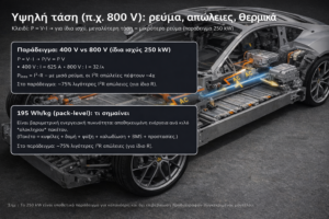 Η λειτουργία της μπαταρίας βασίζεται στην ηλεκτροχημεία των στοιχείων λιθίου. Κάθε κυψέλη Li-ion αποτελείται από μια άνοδο (συνήθως γραφίτης), μια κάθοδο (οξείδια μετάλλων του λιθίου όπως NCM) και έναν ηλεκτρολύτη που επιτρέπει στα ιόντα λιθίου να μετακινούνται. Κατά την εκφόρτιση, τα ιόντα λιθίου ρέουν από την άνοδο προς την κάθοδο μέσω του ηλεκτρολύτη, ενώ τα ηλεκτρόνια ρέουν μέσω του εξωτερικού κυκλώματος παρέχοντας ηλεκτρικό ρεύμα. Η ενέργεια που παράγεται είναι ανάλογη της τάσης (περίπου 3,7 V ονομαστική ανά στοιχείο) επί το ρεύμα. Στο Elettrica, με ~210 στοιχεία σε σειρά, η ονομαστική τάση αγγίζει ~800 V. Η υψηλή αυτή τάση είναι επωφελής λόγω του νόμου της ισχύος: για δεδομένη ισχύ, αυξημένη τάση σημαίνει χαμηλότερο ρεύμα (I = P/V), άρα μικρότερες απώλειες I²R και μικρότερη θέρμανση αγωγών και τρανζίστορ. Η ενεργειακή πυκνότητα 195 Wh/kg υποδηλώνει προηγμένα υλικά στην κατασκευή των κυψελών (πιθανώς υψηλή περιεκτικότητα σε νικέλιο στην κάθοδο για υψηλή χωρητικότητα) και ελαφρύ σχεδιασμό πακέτου. Η ψύξη της μπαταρίας διέπεται από τις αρχές της θερμοδυναμικής και μεταφοράς θερμότητας: η κυκλοφορία υγρού ψυκτικού μέσω πλακών εξασφαλίζει αγώγιμη απορρόφηση θερμότητας από τις κυψέλες και μεταφορά της μέσω συναγωγής προς το ψυγείο. Η ομοιόμορφη θερμοκρασία είναι κρίσιμη, διότι διαφορές θερμοκρασίας οδηγούν σε άνιση καταπόνηση των κυψελών και μειώνουν τη διάρκεια ζωής τους. Η Ferrari εφάρμοσε εξελιγμένες λύσεις όπως θερμικές μόνωση μεταξύ των modules και αγώγιμες θερμικές επαφές (thermal interface materials) ώστε κάθε κυψέλη να λειτουργεί στο βέλτιστο θερμοκρασιακό εύρος.